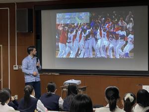 Ambassador Roberto Takata presented us with interesting information on various aspects of Dominican Republic, including its history, sports, events, and food culture. At the end of the lecture, the Embassy staff performed a dance, and the students commented that it made them want to learn to dance and that they were interested in the Dominican Republic and Spanish language.