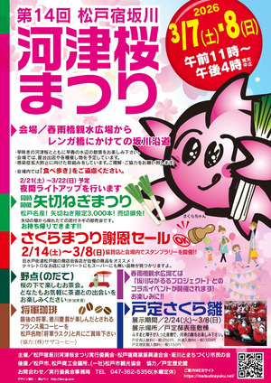 第14回を迎える河津桜まつりでは、松戸神社横の坂川沿いに立ち並ぶ早咲きの河津桜の木が、春の訪れを知らせてくれます。松戸の希少なブランドネギ「矢切ねぎ」の販売は例年大変な人気です。そのほか屋台出店に加えて、今回は春雨橋親水広場ではご家族で楽しめる屋外イベントが予定されています。春の一日、水辺と花の風情をどうぞお楽しみください。