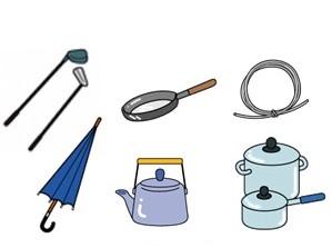 Golf clubs, umnrellas, clothes hanger poles (less than 2 m), flying pans, sauce pans
