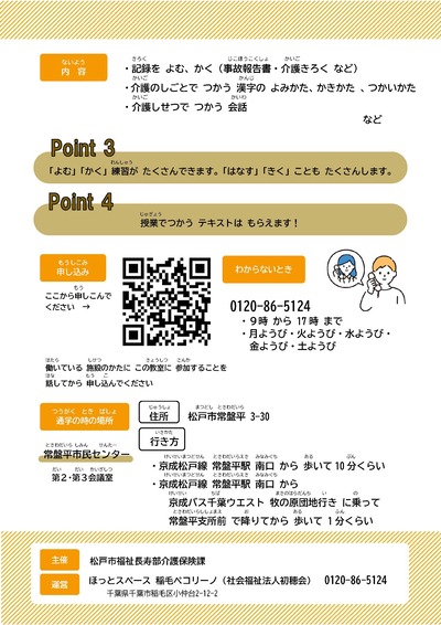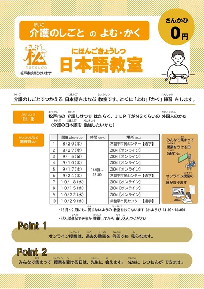 Đối tượng: Người nước ngoài làm việc tại các cơ sở chăm sóc tại thành phố Matsudo, có trình độ tiếng Nhật tương đương N3 (người muốn học tiếng Nhật ngành chăm sóc).