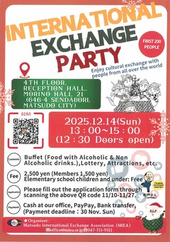 2025年12月14日(星期日)13点至15点 松户市国际交流协会 将举办第36届国际交流联欢会。通过此联欢会可加深日本人与外国人之间的相互交流,共同度过快乐时光。有各式各样的节目和自助餐以及抽奖活动。