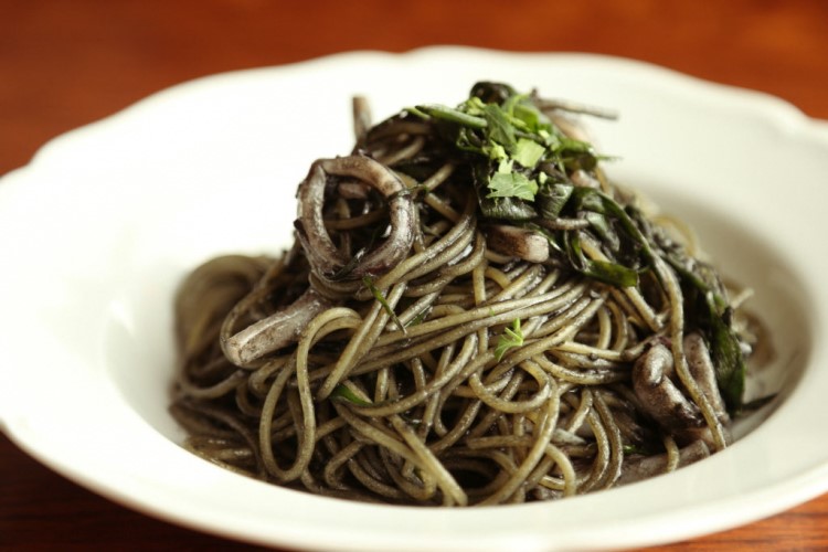 淡路島のダルマイカと松戸産あじさいねぎの竹炭のパスタ