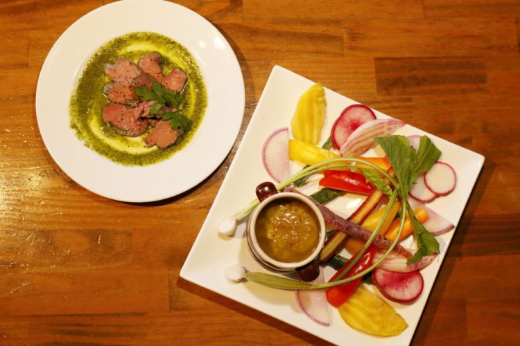 (左)レバーのコンフィ (右)季節野菜のバーニャカウダ