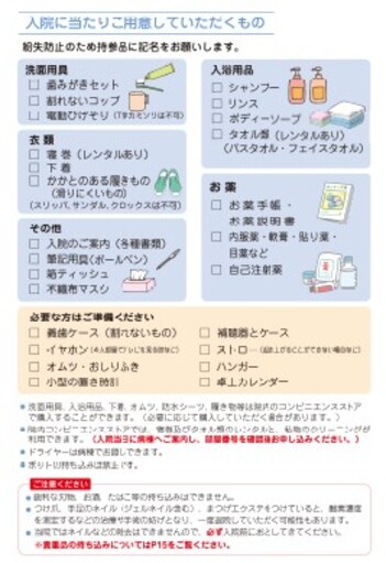 入院にあたりご用意していただくもの