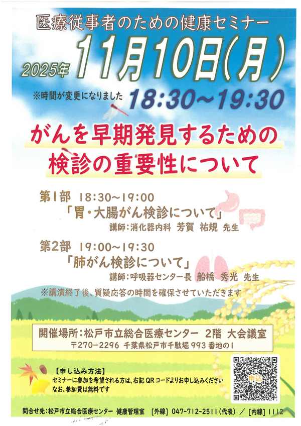 総合医療センター主催、当院消化器内科医師及び呼吸器内科医師による「がんを早期発見するための検診の重要性について」の健康セミナーを開催いたします。講演後、質疑応答の時間を設けています。是非ご参加ください。