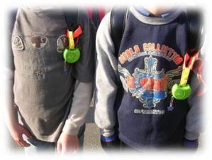 防犯ブザーは首から下げておくと引っ張られてあぶないよ。ランドセルの横に下げるといざというときに手が届かない場合があるから、ブザーの位置を確認しておこうね