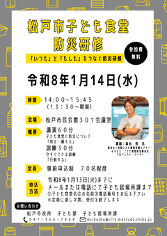 子ども食堂の運営者に向けた防災研修を行い、防災への見識を高めることで、子どもや保護者が安全に安心して、子ども食堂を利用できる環境整備を推進することを目的に開催します。