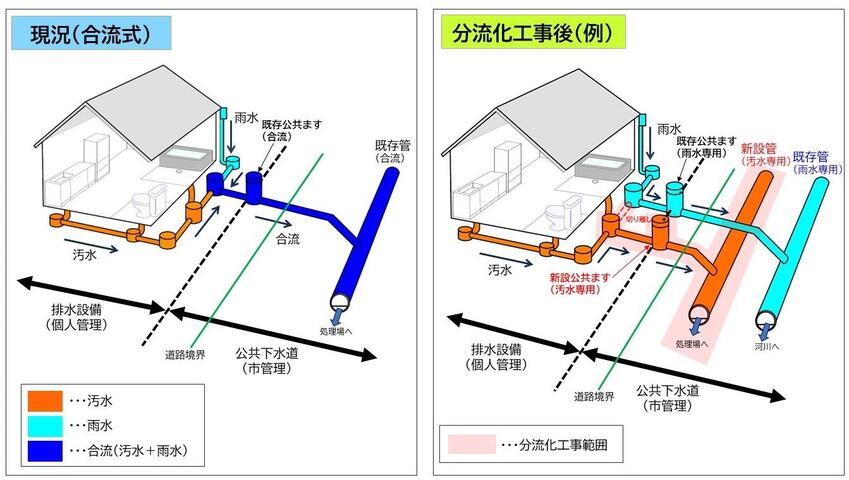 - 既存の合流管は、分流化後は雨水管として利用します。分流化事業により汚水専用の下水道管の新設が完了した路線では、汚水排水を既存の合流管に接続することはできません。