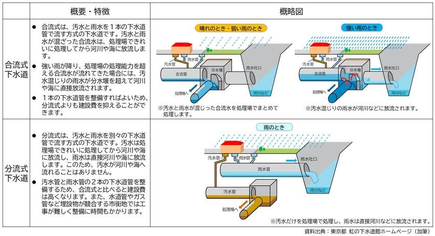 下水道には、「汚水」と「雨水」を1本の下水道管で排水する「合流式」と、「汚水」と「雨水」を別々の下水道管で排水する「分流式」の2つの方法があります。