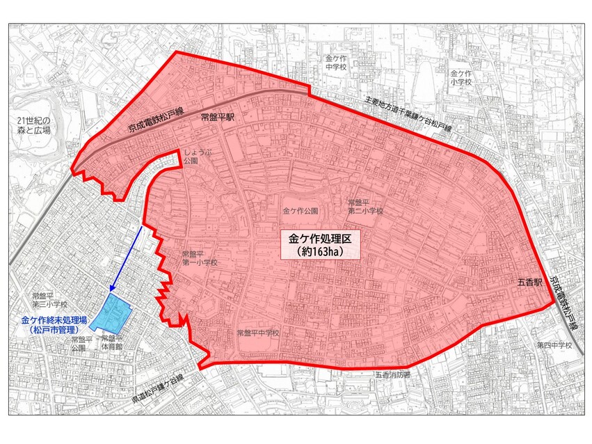 現在は、常盤平一丁目及び常盤平三丁目から常盤平六丁目までの全域と、常盤平二丁目・常盤平七丁目・常盤平双葉町の一部(図面赤色枠内の範囲)が合流式下水道の区域となっており、常盤平公園北側(常盤平松葉町1番地)の金ケ作終末処理場で下水を処理しています。