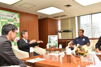 令和5年11月8日(水曜)、ラグビーワールドカップ2023フランス大会で、日本代表として出場したレメキ ロマノ ラヴァ選手が市長を訪問し、ワールドカップの結果報告を行いました。