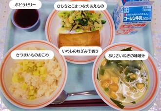 さつまいもおこわ、いわしねぎみそ巻き、ひじきとこまつなのあえもの、あじさいねぎの味噌汁、ぶどうゼリー、牛乳