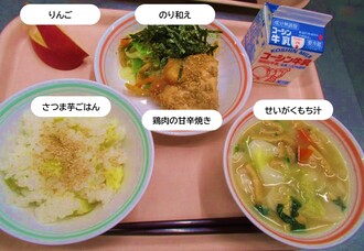 さつま芋ごはん、鶏肉の甘辛焼き、のり和え、せいがくもち汁、りんご、牛乳