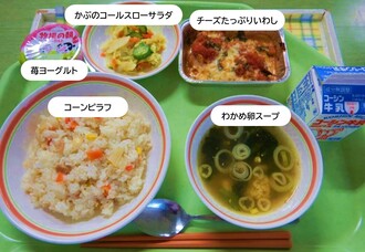 コーンピラフ、チーズたっぷりいわし、かぶのコールスローサラダ、わかめ卵スープ、苺ヨーグルト、牛乳