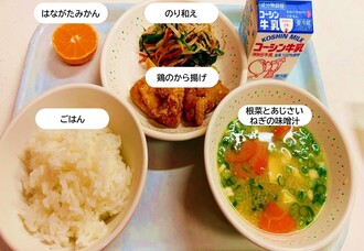 ごはん、鶏の唐揚げ、のり和え、根菜とあじさいねぎの味噌汁、はながたみかん、牛乳