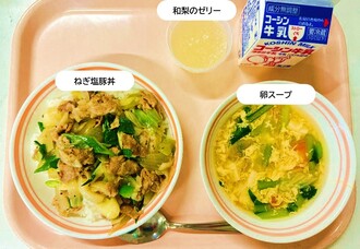 ねぎ塩豚丼、卵スープ、和梨ゼリー、牛乳
