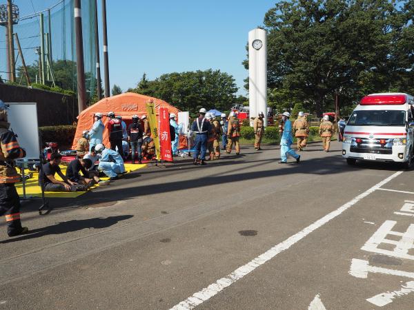 令和2年10月2日(金曜日)に松戸運動公園において、松戸警察署、松戸東警察署、松戸市立総合医療センター、千葉西総合病院、松戸市危機管理課、松戸市消防局の148名により、グルメイベントの準備中にプロパンガスボンベが爆発し、多数の負傷者が発生したとの想定により訓練を実施しました。