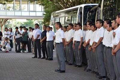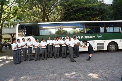学校に到着後の3年生の野球部員たち(1列目の中央は富山理事長)