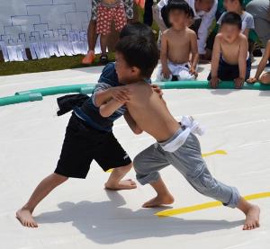 わんぱく相撲には、まわし姿の子どもが大勢参加しました。普段は味わうことができない土俵の上での真剣勝負。小さな体をぶつけ合い、白熱した取組が続きました。真剣勝負に勝つことのうれしさと負けるくやしさを体験できたのではないでしょうか。