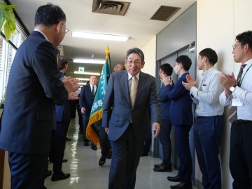 松戸市役所にて拍手で迎えられた野球部メンバーたち。笑顔で大会への意気込みを見せてくれました。