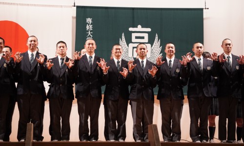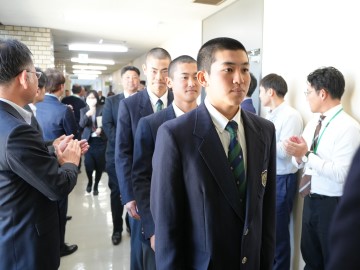 全校生徒から拍手で迎えられ壇上に登る専修大学松戸高校野球部のメンバーたち。授与された選抜旗を手に、在校生からの熱い激励を受け、甲子園出場へ向けての決意を新たにしました。