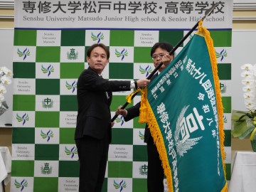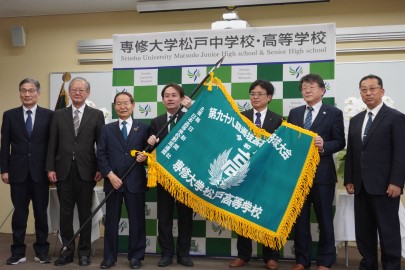 専修大学松戸高等学校の会議室にて、大会出場の証しとなる「選抜旗」の授与式がありました。