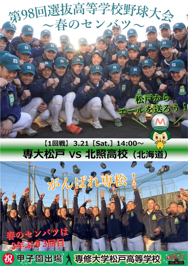 1回戦は3月21日(土曜日)第三試合、北照高等学校(北海道)と対戦の予定です。みんなで専修大学松戸高等学校野球部を応援しましょう!(※試合の日程は天候等により変更になる場合があります)