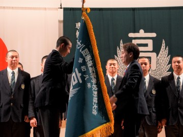 五味校長から高貝主将(注釈1)へ選抜旗授与