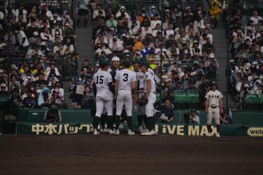 8回裏、大阪桐蔭高校は、ツーベースヒットと送りバントで1アウト3塁のチャンスの場面。セカンドゴロに打ち取る間に3塁走者が生還し、2対3。