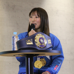 去る9月に開催されたセルビアでの世界選手権で優勝し、来年のパリオリンピックへの出場が内定した地元・松戸出身の須崎優衣選手の姿をひと目見ようと、会場は多くの来場者で埋め尽くされました。オリンピックの金メダル、世界選手権のチャンピオンベルトを手に登場した須崎選手は「こんなに多くの方々にお越しいただけると思っていなかったので、とても嬉しいです」と驚きながらも、満面の笑みで来場者へ感謝していました。