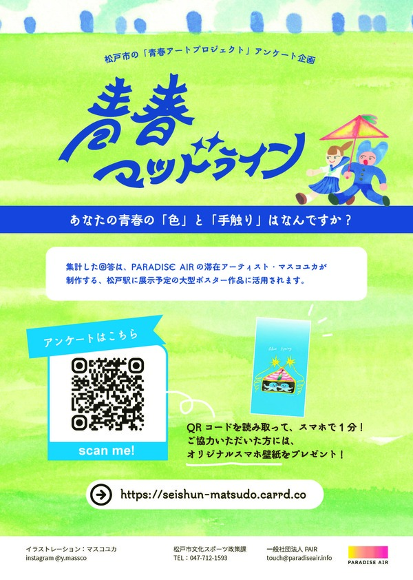 令和7年9月に松戸に滞在したベルリンを拠点に活動するアーティストのマスコユカさんが「青春」に関するアンケート(1分程度)を実施しています。回答は匿名で可能となっており、ご参加いただいた方には オリジナル壁紙イラストをプレゼントしています。