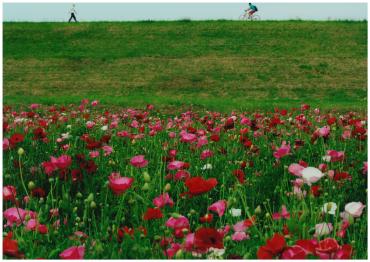 ふれあい松戸川の花畑には、四季折々の花がボランティアの手によって植えられます。江戸川の堤では、人々が満開のポピーを横目に散策したり、サイクリングを楽しんだり、犬の散歩などと、広々した天と地を健康維持の場として活用しています。
