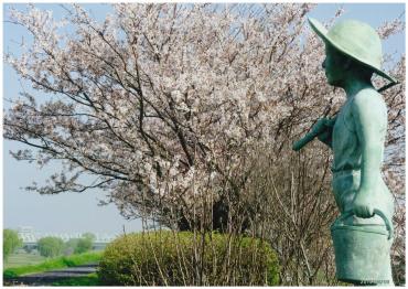 川の一里塚、今年も綺麗に桜が咲きました。釣り道具とバケツを持ってこれから川遊びかな?