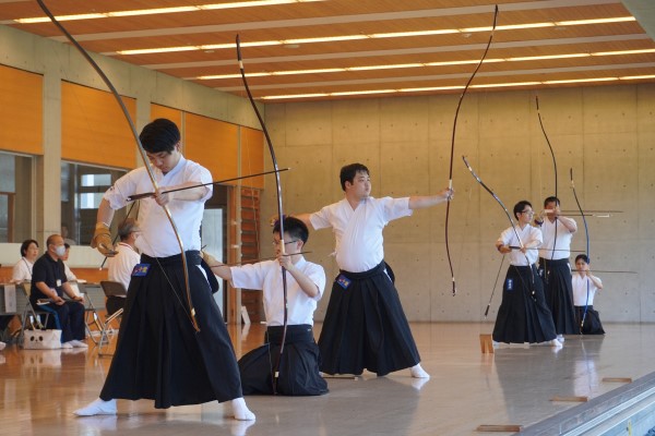 実際に弓を引けるようになるまで、さまざまな段階を上がっていきます。「まずは道具を持たないで動きだけを練習します。次にゴム弓や素引きなどをやり、その後初めて矢を使える。近い距離から始めます(奥田さん)」。ここまでで驚くほどの差が出るそうです。このような指導を通じて、1年程経つとやっと的に矢が当たるようになります。「基本動作には必ず礼法が付随し、立ち方・歩き方・座り方など、動作と礼法は一体になっています。弓道の伝統はもちろんのこと、各段階を上がっていくときに、一つ一つ動作と礼法を一体にし、 最終的にはその礼法と射義が一致するようにしています。(奥田さん)」と、とにかく基本を徹底的に、時間をかけて教え込みます。また、中学では実質2年半で結果を出さなくてはいけないため、「社会人になると厳しく求められる礼法よりも、射義に時間を取るようにしています」と結果を出すための工夫も教えてくれました。