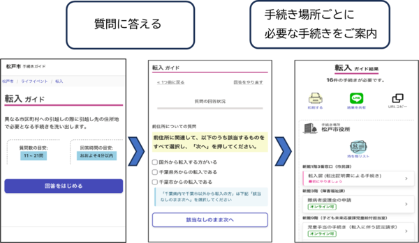 引越し・結婚・出産などライフイベントに関する手続きについて、簡単な質問に答えていくだけで、ご自身の状況や家族構成に合った「必要な手続き」「手続きの方法」「持ち物」などをご案内します。