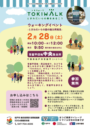松戸市では常盤平団地エリアにおけるSDGs推進の取組みの一環として、健康ウォーキングプログラム「TOKIWALK(トキウォーク)~ときわだいらの森をあるこう~」を千葉大学、UR都市機構とともに開発・設置しています。