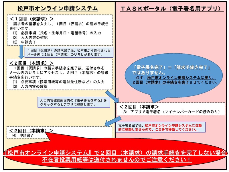 不在者投票用紙等の請求手続きは、松戸市オンライン申請システム上で請求の手続きを2回行っていただく必要があります。