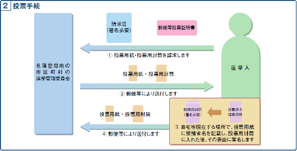 郵便等投票証明書の交付申請及び投票手続きの流れ