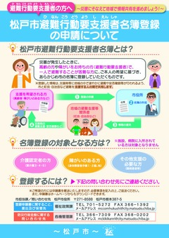 高齢の方や障害をお持ちの方等、一人で避難することが困難な方を登録した避難行動要支援名簿の作成や更新等を実施いたします。併せて、安否確認方法や避難所への避難方法等、一人ひとりに合わせた個別避難計画を作成し、災害時に地域で避難行動要支援者の避難を支援する体制を整備します。