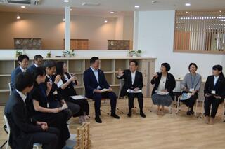 こども政策対話では、子育て中の親子、保育を学んでいる学生など7名が参加し、子育てをする中で感じていること、子育てしやすい環境について意見を交わしました。