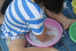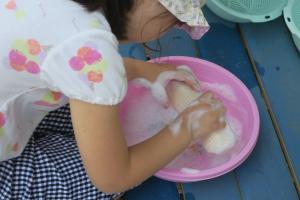 洗面器にボディーソープと水を入れて、手でスポンジをギュギュと握って泡をたくさん作って、泡の感触を楽しみます。今回は泡遊びを洗濯ごっこにつなげていました。