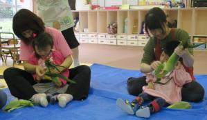 あまりの暑さで、体への負担が心配な日は、戸外での活動は控え、夏野菜で作ったスタンプを押して遊んだり、冷たく冷やしたスライムに触れたりなど、室内の遊びを工夫して楽しみました。色々な素材を利用した遊びの中で、触る、握る、ちぎるなど、感触の面白さを少しずつ味わえたように思います。
