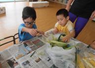 大きなビニール袋から緑色の皮がついたとうもろこしを一人ひとりに渡していきます。不思議そうにいろいろな方向から見てみたり、ひげの部分を手でつまんでみたり、大人と一緒にむいたり、いろいろな姿がありました。