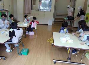 通常は盛り付けられた状態で配膳される給食ですが、食育の一環として炊飯器と鍋をクラスに持っていき、目の前で温かいごはんと汁物を盛り付けてもらいます。炊飯器の中をのぞいたり、一人または大人と一緒に盛り付けてもらったご飯の茶碗を両手でそっと持って自分のお盆に乗せたりする子どもたち。いつもよりも暖かい汁物は「ふーふー」と少し冷ましてから飲む姿もありました。普段とはちょっと違う特別感も味わえました。