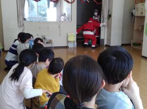 突然、現れたサンタクロースに目を丸くして驚く子、担任の後ろに隠れて離れて見ている子、