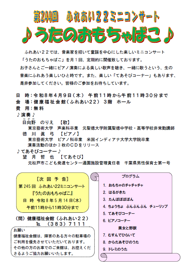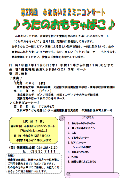 ふれあい22ミニコンサート ♪ うたのおもちゃばこ ♪ を開催します