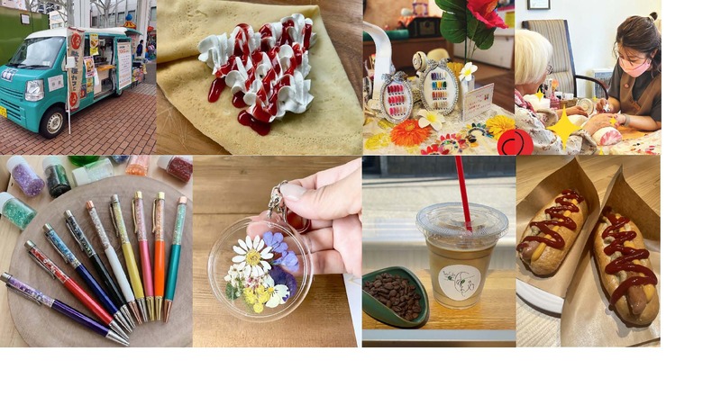 豆のちから(おからドーナツ・おからを使用した菓子類)、駄菓子屋カフェくるくる(肉巻きおにぎり・たこせん・ワッフル・やきそば・駄菓子・ジュース・くじびきなど)、ベースカフェ(ホットドッグ・コーヒー)、niko pan kobo(パン)、モンステラテラス(クレープ)、地域への架け橋プロジェクト(駄菓子)、松戸市はつらつクラブ連合会(野菜)、松戸市シルバー人材センター(手工芸品)