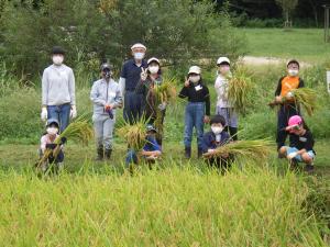 保護者の方にも手伝っていただき、約2時間で田んぼの稲を全て刈ることができました!今回刈った稲は、10月中旬までみどりの里で干し、乾燥させる予定です。田んぼのすぐ横で干しているので、昔ながらの「はせ掛け」風景をご覧になってみてはいかがですか?