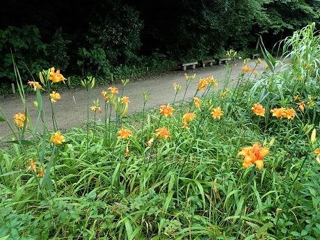 ユリに似た美しい花、ヤブカンゾウが咲いています。なかなか梅雨が明けませんが、あざやかなオレンジ色は夏を思わせてくれます。野草園と特にみどりの里で多く見ることができます。(担当:お)