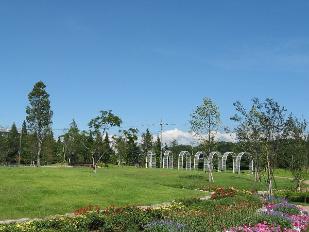 芝生広場の奥にあるバラのアーチ。バラが伸びて育つ頃、あなたは誰と歩きますか?左側にはサクラが植栽され、春にはサクラの小道になります。